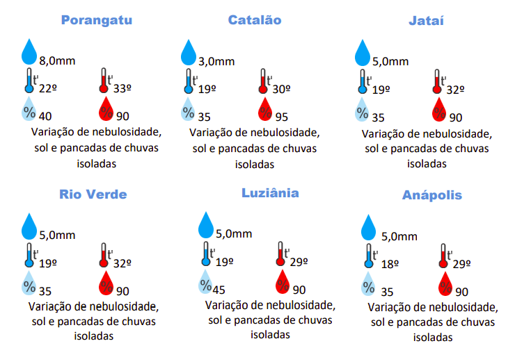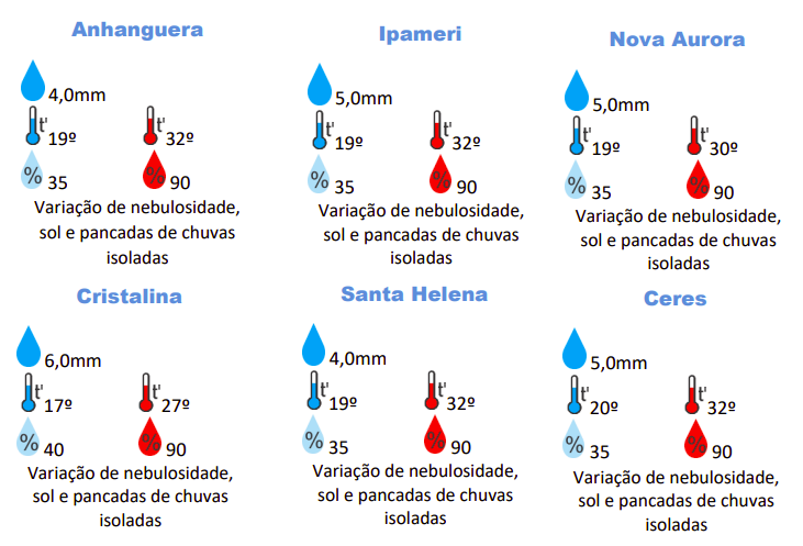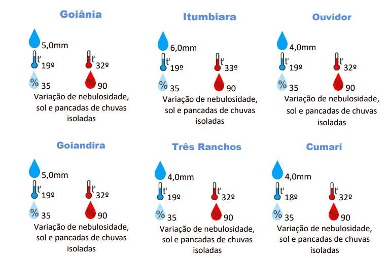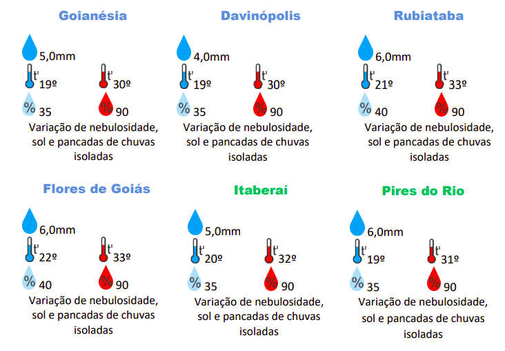Conforme indica o prognóstico semanal, nessa segunda-feira (21) a expectativa é de dias com altas temperaturas e formação de áreas de instabilidade em várias regiões de Goiás. Em Porangatu, Flores de Goiás, Itumbiara e Rubiataba, por exemplo, a previsão máxima é de 33°C, com variação de nebulosidade e pancadas de chuvas isoladas.