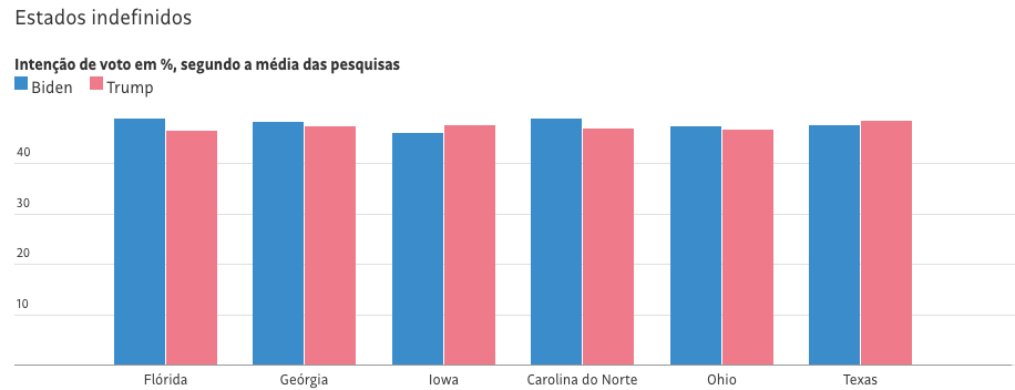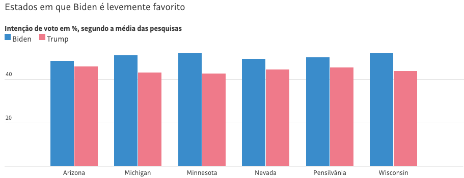 Biden aproveitou a resposta ineficaz de Trump diante da pandemia para arrancar nesses estados. O objetivo é tentar recuperar nichos perdidos para Trump há quatro anos, como Pensilvânia, Michigan e Wisconsin, além de conquistar novos terrenos, como Arizona, Carolina do Norte e Geórgia, redutos republicanos que têm sofrido mudanças demográficas que os deslocaram mais à esquerda.