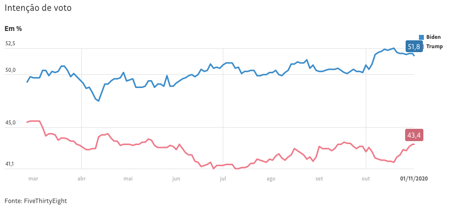 O repique de casos de Covid-19 em 47 dos 50 estados americanos a quatro dias da eleição e a contaminação do próprio presidente, no início de outubro, provocaram aumento discreto mas constante das intenções de voto para Biden, que já liderava por ao menos quatro pontos percentuais desde março.