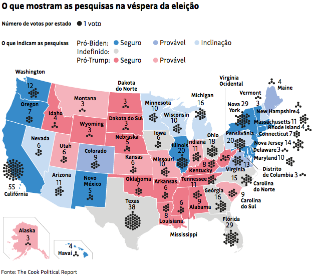 Funciona assim: regiões que começam a apuração pelo voto presencial, como a Pensilvânia, poderiam colocar Trump na frente de início, já que essa é a modalidade preferida dos republicanos. O cenário, porém, estaria sujeito a mudanças conforme fossem contados os votos por correio, opção feita por mais democratas e que, de acordo com as regras do estado, podem entrar na contagem até sexta-feira (6).