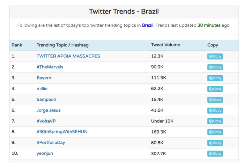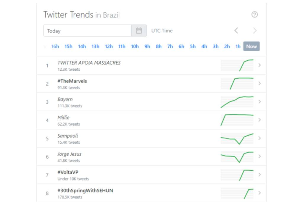 Contudo, a hashtag desapareceu das listas de assuntos do momento, deixando de ser visível, o que contradiz as informações de três serviços de monitoramento de tendências nas redes, que mostram o assunto “Twitter apoia massacres” no topo dos trending topics da plataforma no Brasil.