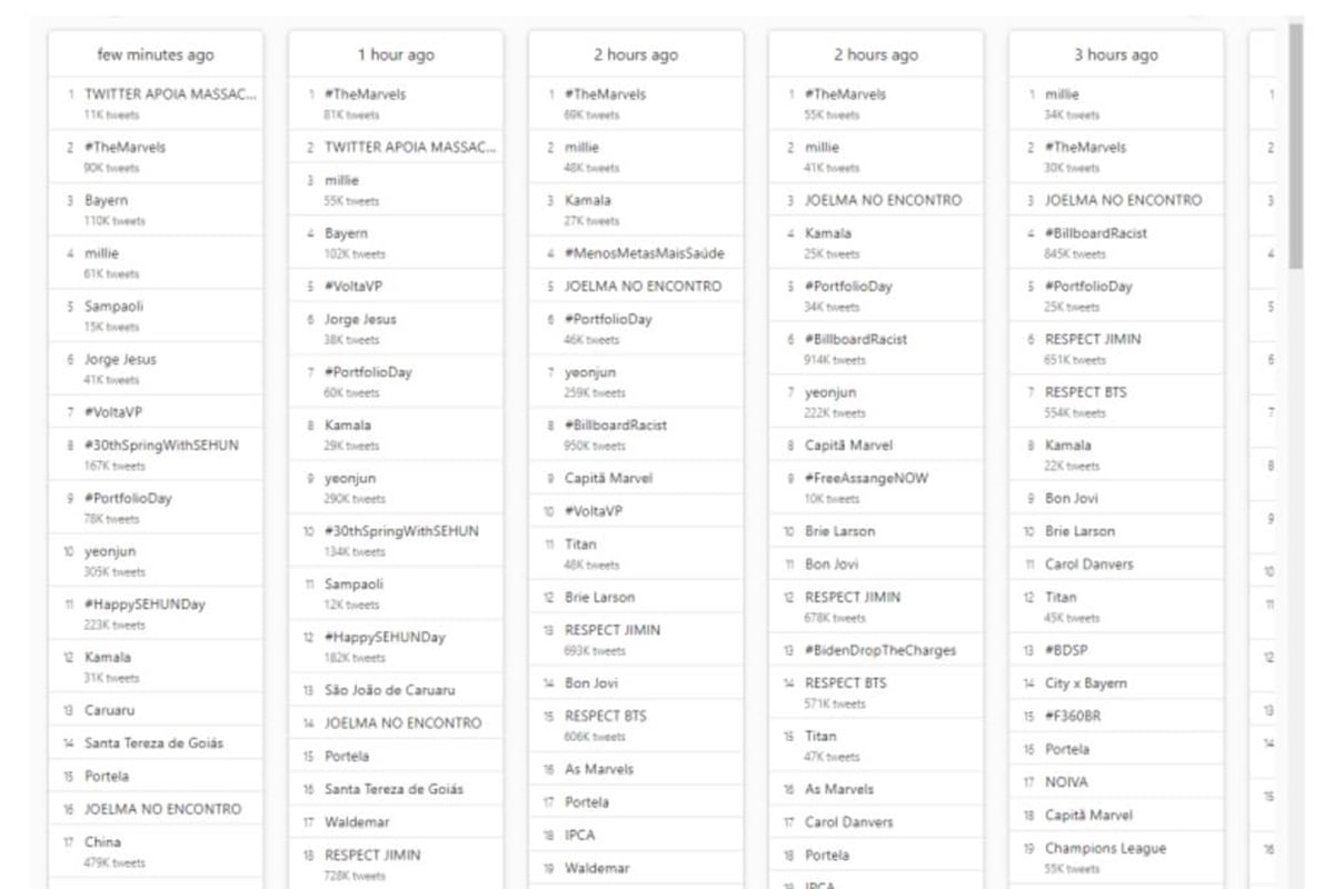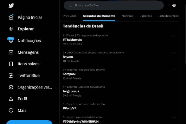 Já na listagem do próprio Twitter, o assunto não existe. Os dois termos mais comentados segundo a lista oficial da plataforma, entretanto, condizem com o que apresentam os monitores independentes. São eles: “TheMarvels” e “Bayern”.