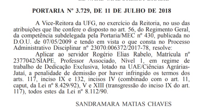 De acordo com a portaria, assinada pela vice-reitora Sandramara Matias Chaves, Rogério era professor Nivel 1 e trabalhava em regime de dedicação exclusiva lotado na UAE/Ciências Agrárias de Jataí. (Veja cópia do documento).