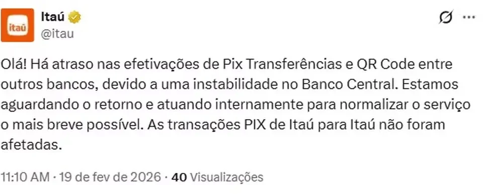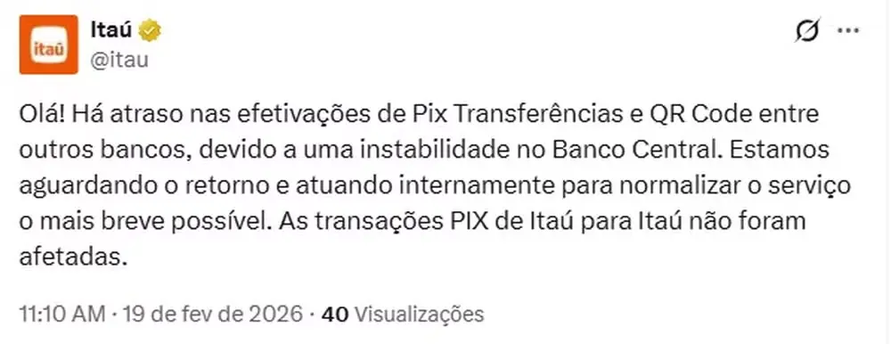 O aplicativo do Itaú Unibanco comunicou aos clientes que tem instabilidade no meio de pagamento. Em mensagem no aplicativo, informou: “Estamos com instabilidade no Pix. Por favor não refaça a operação e aguarde, em breve será normalizado”.