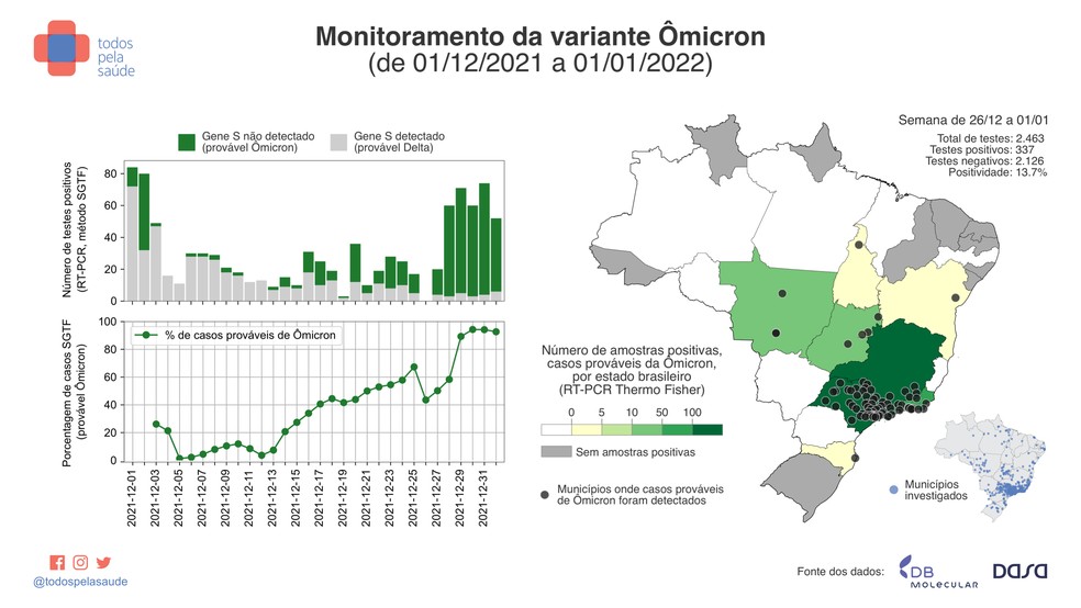 A variante ômicron tem prevalecido em 92,6% das amostras analisadas no Brasil por pesquisadores do Instituto Todos pela Saúde (ITpS), em parceria com os laboratórios Dasa e DB Molecular, que analisou 2.463 amostras coletadas entre 26 de dezembro e 1º de janeiro. O resultado foi constatado ao verificar 337 amostras da SARS-CoV-2, sendo que em 312 há indicação de infecção pela variante ômicron.