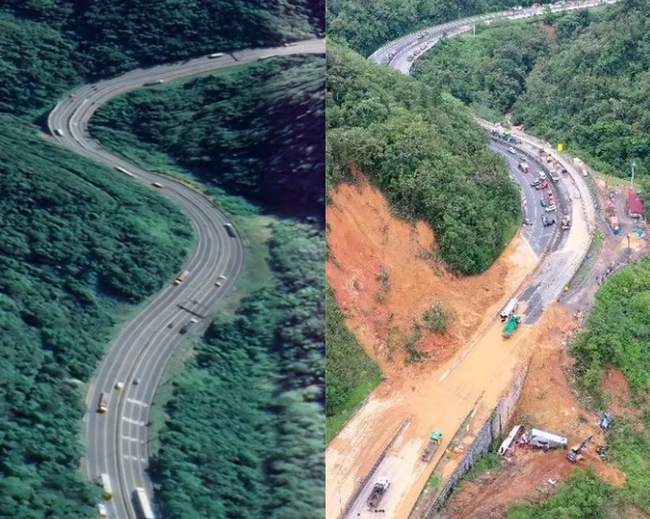 A força das chuvas na região arrastou toneladas de terra, vegetação e detritos que tomaram conta das pistas da rodovia. Imagens de satélite ajudam a entender a dimensão do estrago feito pelo deslizamento.