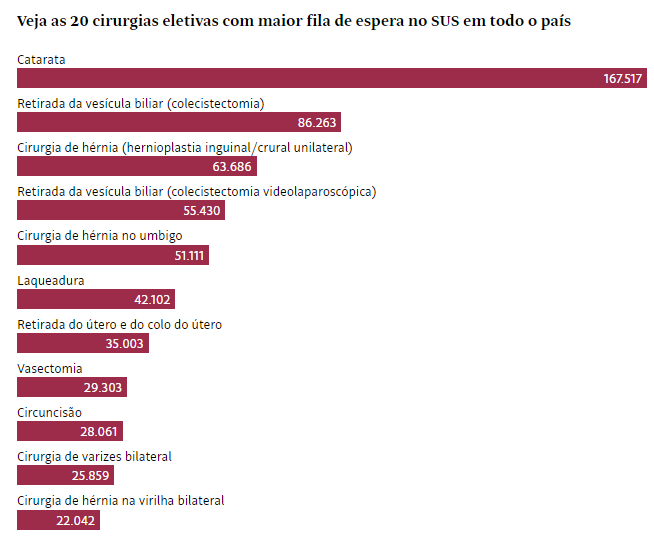 Catarata e retirava da vesícula. Os dois procedimentos respondem atualmente pelas maiores filas no SUS (Sistema Único de Saúde) entre as cirurgias eletivas, aquelas que não são consideradas de urgência.
