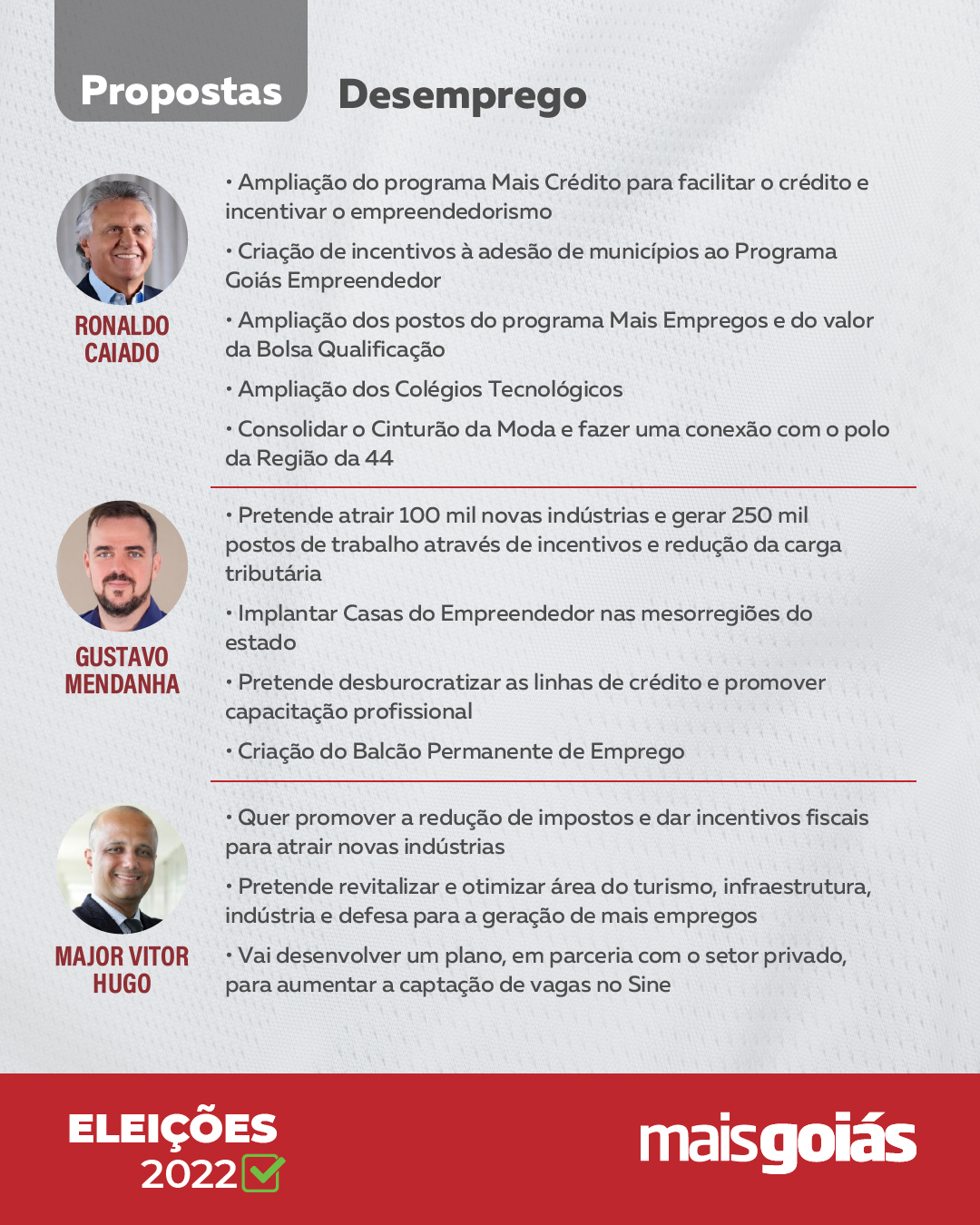 Caiado, que concorre à reeleição, afirma que Goiás possui um dos menores índices de desemprego do Brasil e foi o primeiro Estado a iniciar a retomada econômica pós-pandemia. O governador, no entanto, ressalta que não está satisfeito e não medirá esforços para oferecer mais e melhores empregos. Para os próximos anos, caso seja novamente escolhido pelos goianos, pretende ampliar o programa Mais Crédito; criar incentivos à adesão de municípios ao programa Goiás Empreendedor; ampliar postos do Mais Emprego; ampliar o Bolsa Qualificação, bem como consolidar o Cinturão da Moda e fazer uma conexão com o polo da Região 44.