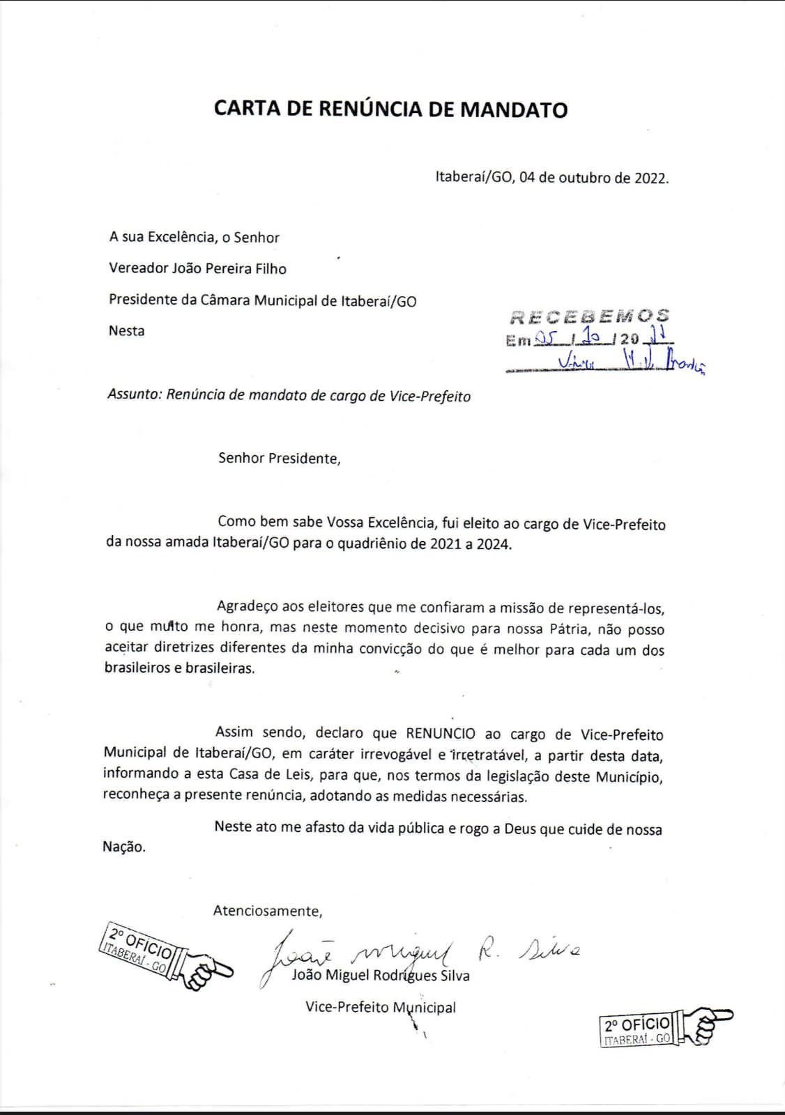 Em carta de renúncia de mandato, o vice-prefeito de Itaberaí João Miguel Rodrigues, conhecido como Miguelzinho Baiano, deixou o cargo. “Neste momento decisivo para nossa Pátria, não posso aceitar diretrizes diferentes da minha convicção do que é melhor para cada um dos brasileiros e brasileiras”, escreveu.