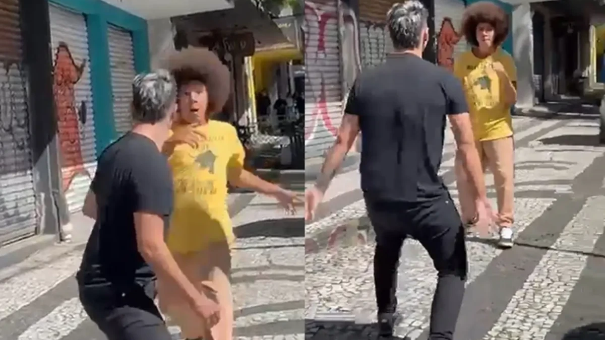 Outro ângulo, filmado de dentro de um carro, mostra Renato com o nariz sangrando enquanto os dois continuam trocando golpes no meio da rua. Eles ainda se provocam e tentam se agarrar, até que testemunhas entram na frente e separam a briga.