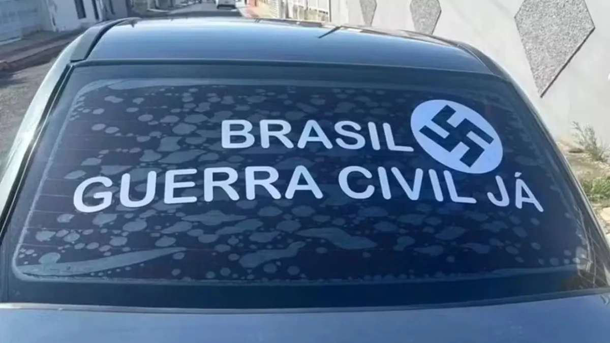 De acordo com as autoridades, o símbolo nazista aparecia acompanhado da frase “Brasil guerra civil já”, o que motivou a abordagem policial. O idoso, que não teve o nome divulgado, foi identificado como o proprietário do carro e conduzido à Central da Polícia Civil do município para prestar esclarecimentos.