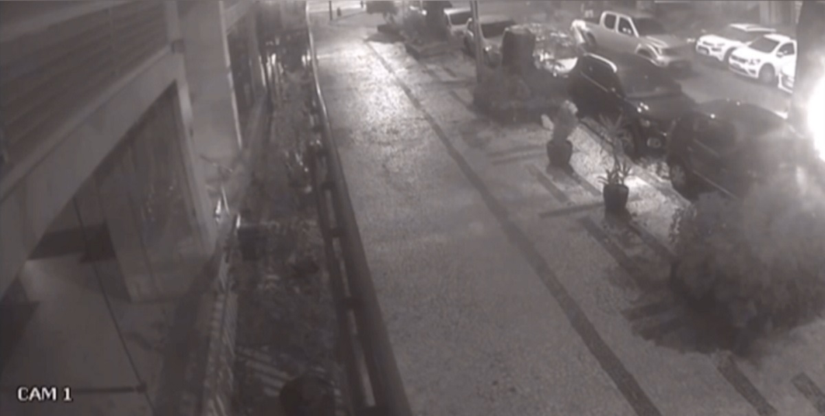 Num gesto de puro reflexo, o homem que seria o alvo dos disparos faz um gesto brusco e consegue escapar sem ferimentos. A cena acima foi flagrada por uma câmera de segurança. A gravação também mostra veículo usado no crime deixando o local em alta velocidade.