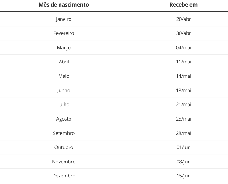 O pagamento começa no dia 20 de abril e vai até 15 de junho, de acordo com o mês de nascimento do trabalhador. Os primeiros a receber serão os nascidos em janeiro, a partir de 20 de abril. A retirada será possível até o dia 15 de dezembro.