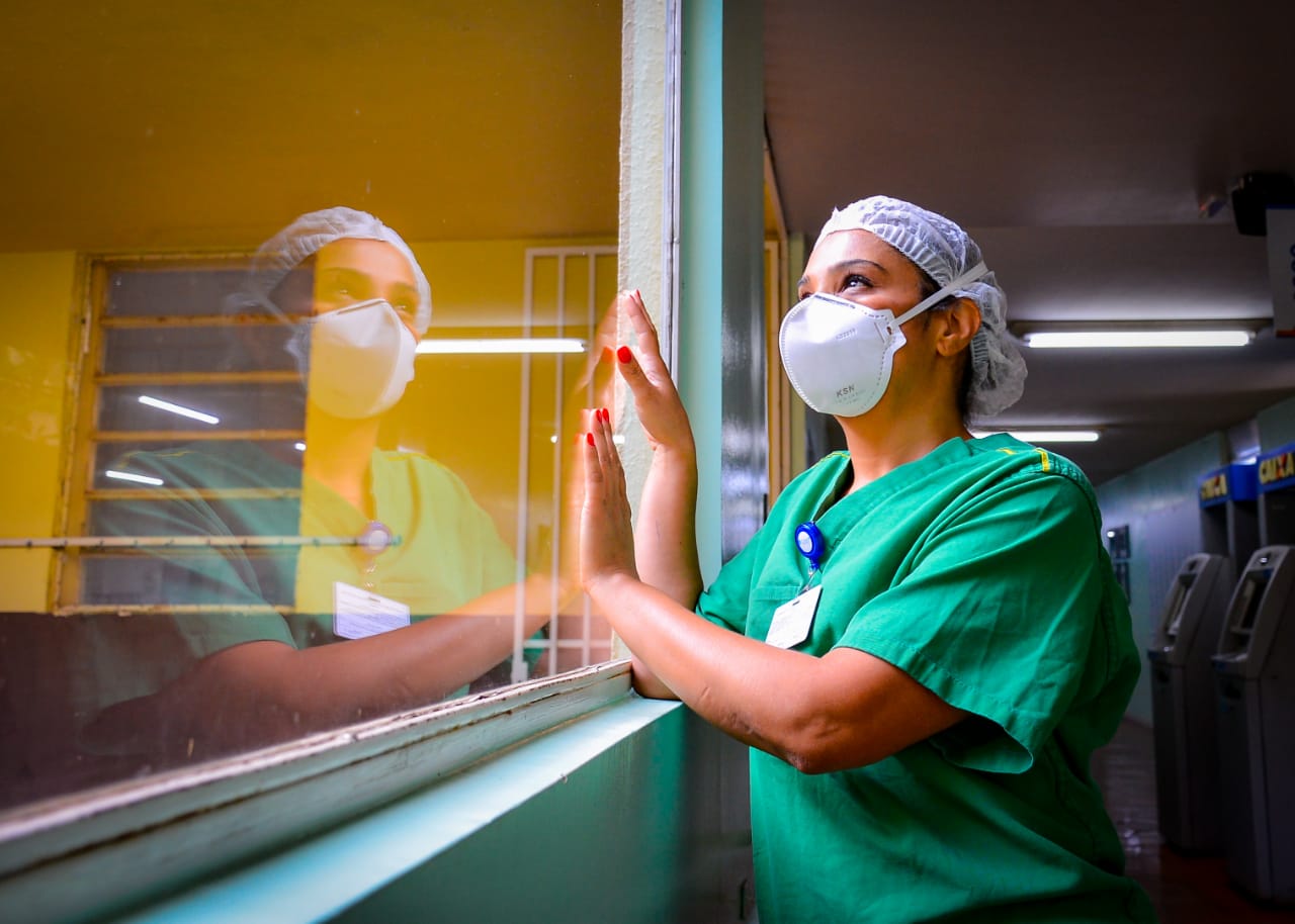 Enfermeira do plantão noturno no Hospital e Maternidade Municipal Célia Câmara em Goiânia, Raquel Fernandes conta que se comove com o medo dos pacientes que não podem ficar acompanhados da família. “Eles ficam sozinhos com a gente. A companhia deles somos nós”, diz ela.