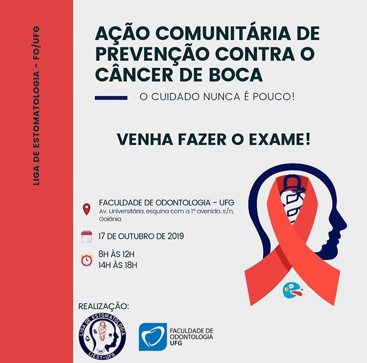 Nesta quinta-feira (17), Goiânia terá uma ação comunitária no intuito de alertar e orientar a população sobre o câncer de boca. O evento terá exames gratuitos para toda a comunidade e acontecerá na Faculdade de Odontologia da Universidade Federal de Goiás (UFG), no Setor Leste Universitário. O atendimento acontecerá das 8h às 12h e das 14h às 18h.