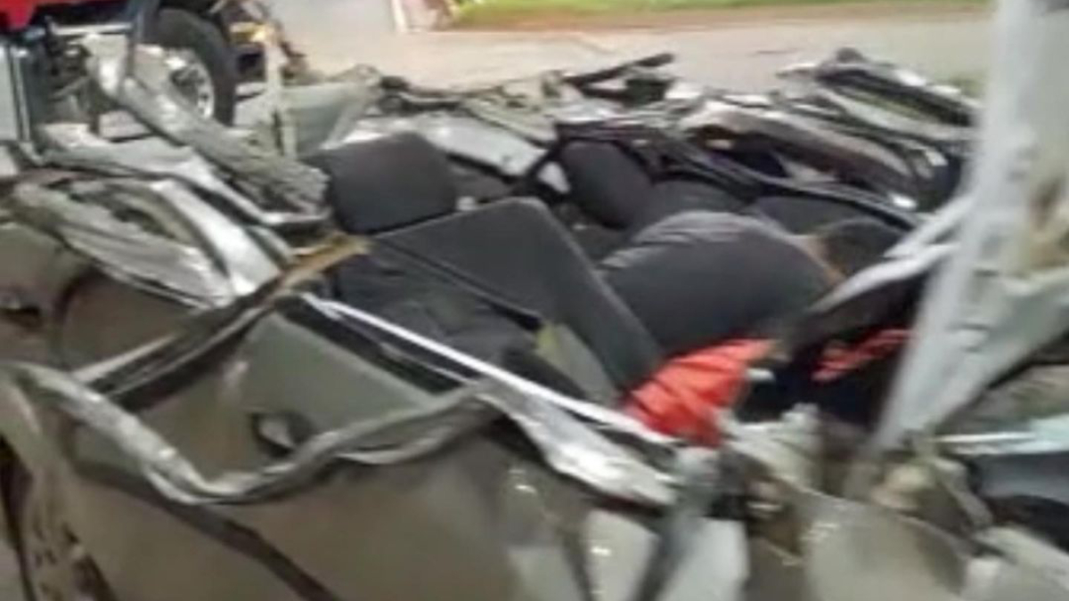 Segundo o Corpo de Bombeiros, o impacto da batida foi tão forte que arrancou o teto do carro e destruiu toda a parte frontal do veículo.