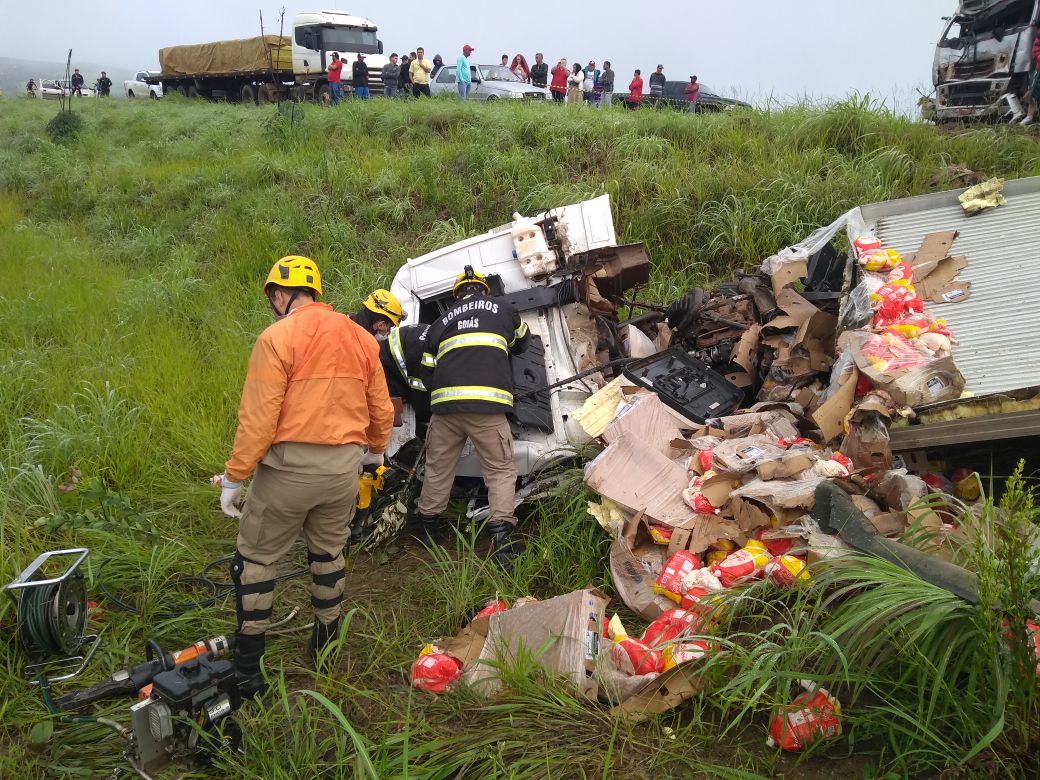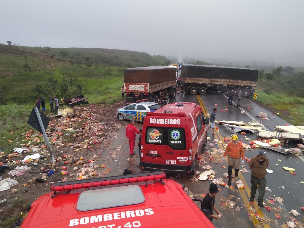 Um dos caminhões estava carregado com frango e espalhou a carga pela pista, que está interditada nos dois sentidos. Com a colisão uma pessoa morreu e outras duas ficaram feridas