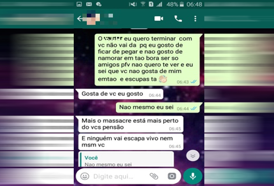 Conversa no Whatsapp mostra que a menor tentava terminar o relacionamento e foi respondida pelo adolescente com “o massacre está mais perto do que vocês pensam” e que “ninguém vai escapar vivo, nem mesmo você”. A Guarda Civil recebeu denúncia e o menor foi levado para a Delegacia de Apuração de Atos Infracionais (Depai).