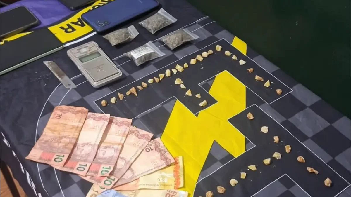 O adolescente ainda indicou a existência de mais entorpecente no local. Foram apreendidos uma balança de precisão, 45 porções de crack, quatro porções de maconha, quatro aparelhos celulares, a quantia de R$ 128 em dinheiro, além de um pires e uma lâmina de estilete usados no preparo de fracionamento das drogas.