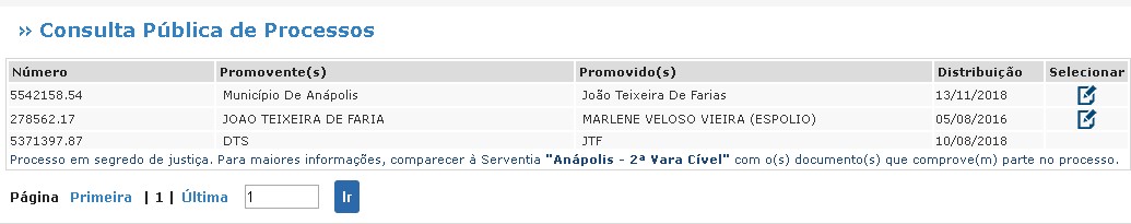 Atualmente, há três processos envolvendo João de Deus no Tribunal de Justiça do Estado de Goiás. Uma das ações é movida pelo Município de Anápolis por meio da Vara da Fazenda Pública Municipal. Outra, de Nulidade e Anulação de Partilha e Adjudicação de Herança, foi iniciado pelo próprio João contra duas pessoas: Marlene Veloso Vieira e Edson Veloso Vieira. Um terceiro processo, iniciado no último 10/8, encontra-se em segredo de justiça e não é possível acessá-lo (imagem).