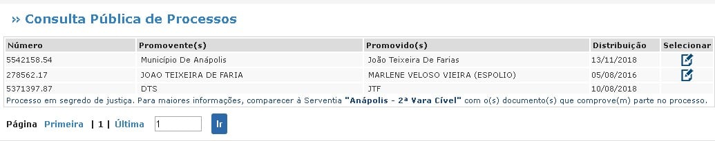Atualmente, há três processos envolvendo João de Deus no Tribunal de Justiça do Estado de Goiás. Uma das ações é movida pelo Município de Anápolis por meio da Vara da Fazenda Pública Municipal. Outra, de Nulidade e Anulação de Partilha e Adjudicação de Herança, foi iniciado pelo próprio João contra duas pessoas: Marlene Veloso Vieira e Edson Veloso Vieira. Um terceiro processo, iniciado no último 10/8, encontra-se em segredo de justiça e não é possível acessá-lo (imagem).