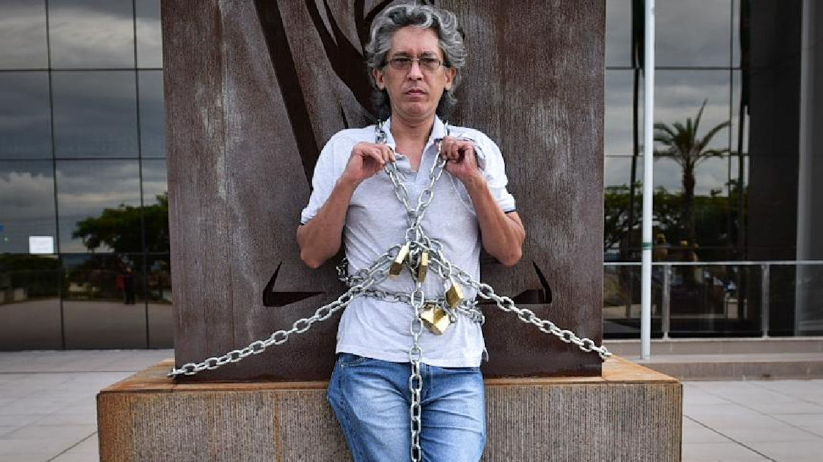 Advogado se acorrenta em frente ao Fórum de Goiânia para protestar contra a Caixa