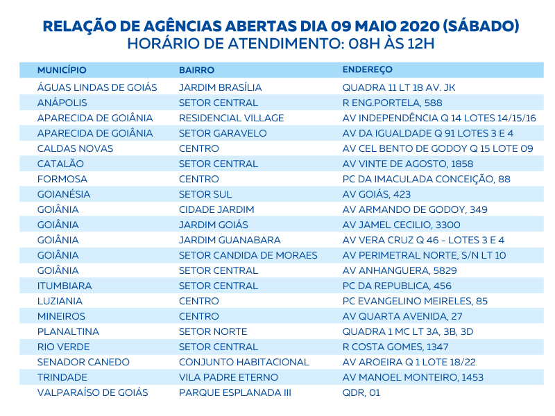 No Estado, as cidades que têm agências que funcionarão são Águas Lindas, Anápolis, Aparecida de Goiânia, Caldas Novas, Catalão, Formosa, Goianésia, Goiânia, Itumbiara, Luziânia, Mineiros, Planaltina, Rio Verde, Senador Canedo, Trindade e Valparaíso de Goiás. Veja o endereço de todas no final do texto.