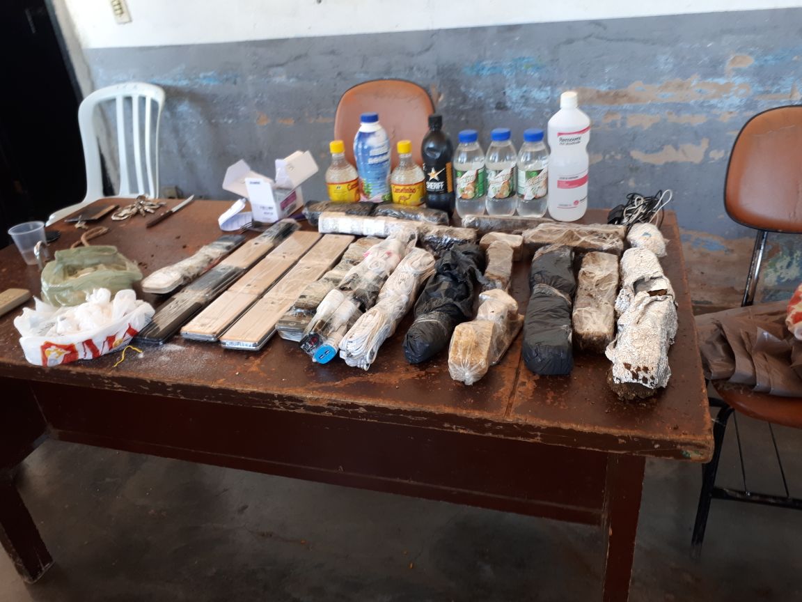 Foram apreendidos três quilos de maconha, 500 gramas de crack, quatro litros de cachaça, um litro de álcool, 1,5 quilos de éter em pó, além de 34 aparelhos de telefone celular, 31 carregadores e 33 fones de ouvido que estavam nas mochilas. Os produtos apreendidos foram encaminhados à Delegacia de Polícia Civil de Rio Verde.