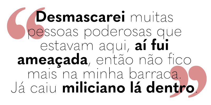 Ela explica que, atualmente, mora com os três filhos (duas meninas e um menino) na barraca da mãe de uma amiga. “Desmascarei muitas pessoas poderosas que estavam aqui, aí fui ameaçada, então não fico mais na minha barraca. Já caiu miliciano lá dentro”, relata. Ela aponta para a filha e diz: “Essa menina, quando virou as costas para chamar meu genro, que estava dentro da minha casa, dispararam tiro. Não tem como ficar lá, ainda. Eles (as crianças) estão com psicológico abalado (sic).”