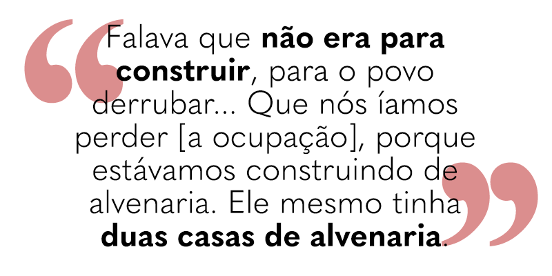 Além disso, ele não deixava que os moradores construíssem casas de alvenaria. “Falava que não era para construir, para o povo derrubar… Que nós íamos perder [a ocupação], porque estávamos construindo de alvenaria. Ele mesmo tinha duas casas de alvenaria. Chamou uma facção, fez uma reunião, esse Paulo, e falou que estávamos perdendo aqui por causa de duas casas sendo feitas de alvenaria”, detalhou a atuação do homem, que ela disse querer apenas tirar vantagens dos locais.