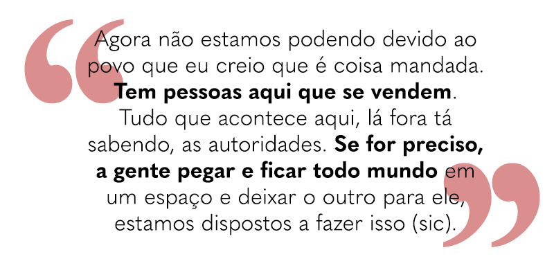 Esse, pelo menos, era o sentimento dela, que é membro da associação. “Agora não estamos podendo [dormir de portas abertas] devido ao povo que eu creio que é coisa mandada. Tem pessoas aqui que se vendem. Tudo que acontece aqui, lá fora tá sabendo, as autoridades. Se for preciso, a gente pegar e ficar todo mundo em um espaço e deixar o outro para ele, estamos dispostos a fazer isso (sic)”, propõe a possibilidade de uma negociação para redução do espaço, se for garantir a permanência dos ocupantes.