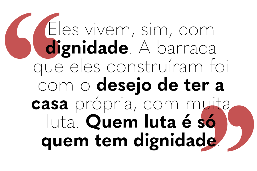 “Eles vivem, sim, com dignidade. A barraca que eles construíram foi com o desejo de ter a casa própria, com muita luta. Quem luta é só quem tem dignidade”, avalia. Segundo ela, quem não aceita ser humilhado pelo estado ou qualquer pessoa é um cidadão digno. “Eles plantam juntos, tem cuidado um com os outros, fazem assembleias, tudo ganha no coletivo, querem, construir tudo junto”, elogia.