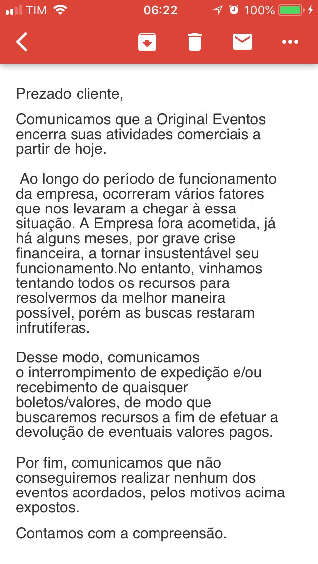 Em e-mail enviado na manhã de hoje (20/12), a empresa contratada alegou que está “encerrando suas atividades comerciais”. Os estudantes tentaram entrar em contato com os proprietários, que teriam fugido durante a madrugada. Segundo alunos, os representantes da Original Eventos excluíram os número de telefone, as contas das redes sociais e até os letreiros físicos da empresa foram retirados do local. A empresa estava localizada Rua C-146, no Setor Jardim América.