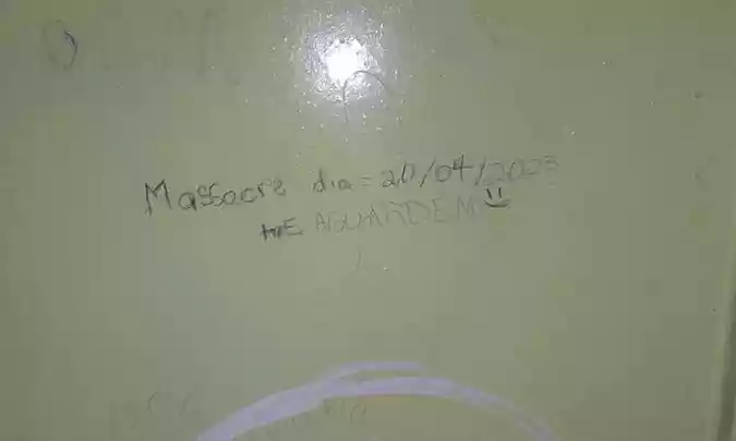 A direção da Escola Estadual João Guimarães Rosa, em Betim (região metropolitana de Belo Horizonte), está em alerta por causa de uma ameaça de massacre daqui a 13 dias. O aviso foi escrito na porta do banheiro feminino. Os dizeres são: “massacre no dia 20/4/2023. Me aguardem!”.