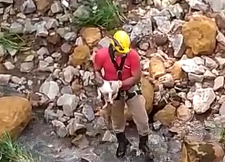 Utilizando técnicas de salvamento, o resgate foi concluído com sucesso. O cão que aguardava na parte de cima, ficou saltitante ao ver novamente o amigo.