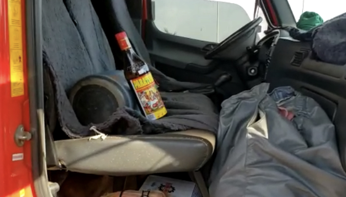 No interior do caminhão os policiais encontraram uma garrafa de cachaça, depositada no banco do passageiro, onde metade da garrafa já havia sido consumida.