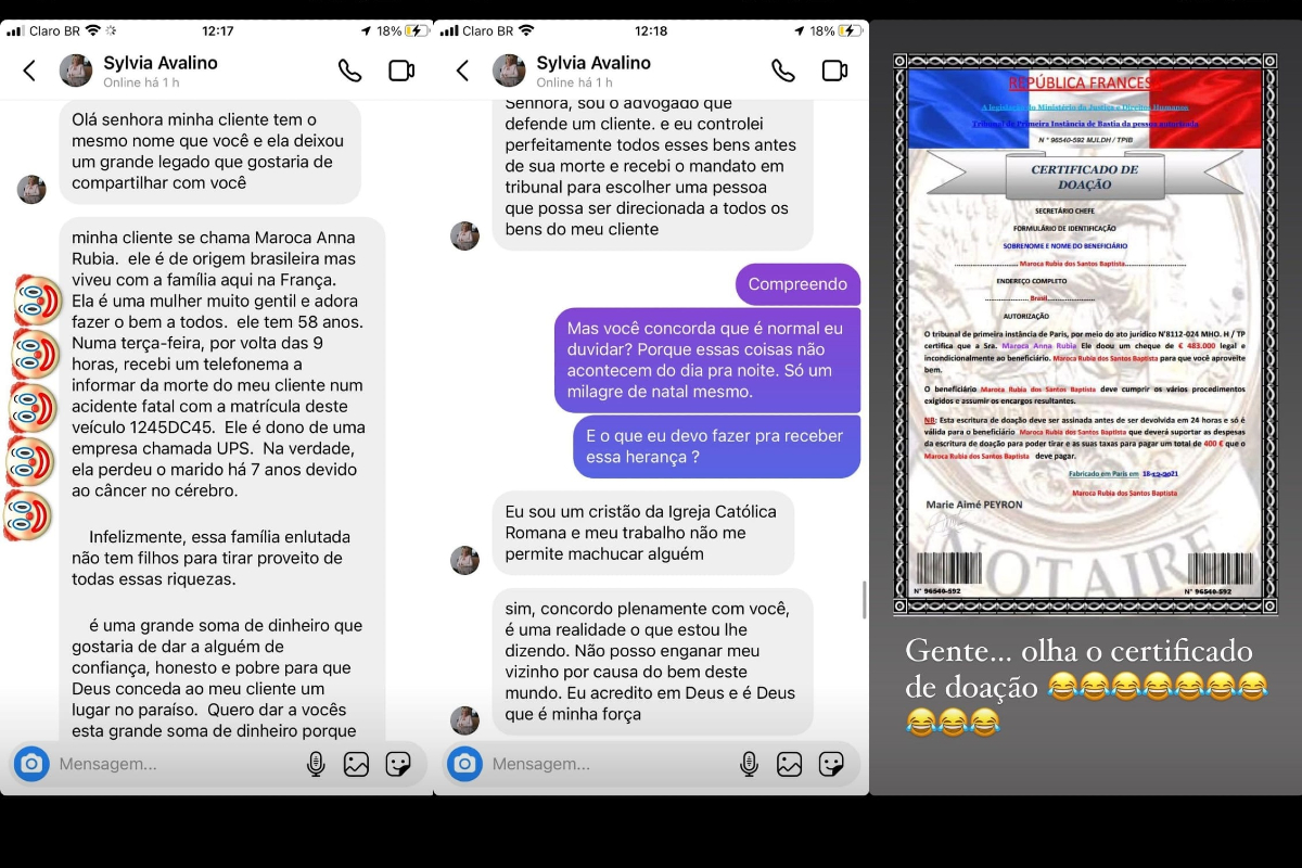 No caso de Mara, ela percebeu se tratar de golpe e, após alertar seguidores e clientes, brincou com a situação. “Se quiserem fazer encomenda, pode. Quem sabe assim eu consiga juntar R$ 3 milhões sem depender de herança nenhuma. Eu até sonhei com o dinheiro. Comprei apartamento e até fui para as Maldivas nos meus sonhos”, brincou, com o falso cerificado de transferência da herança na mão.