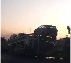 Imagens registradas por populares mostram que um dos carros que era transportado por uma das carretas (cegonha), caiu em via pública e ficou com as rodas para cima.