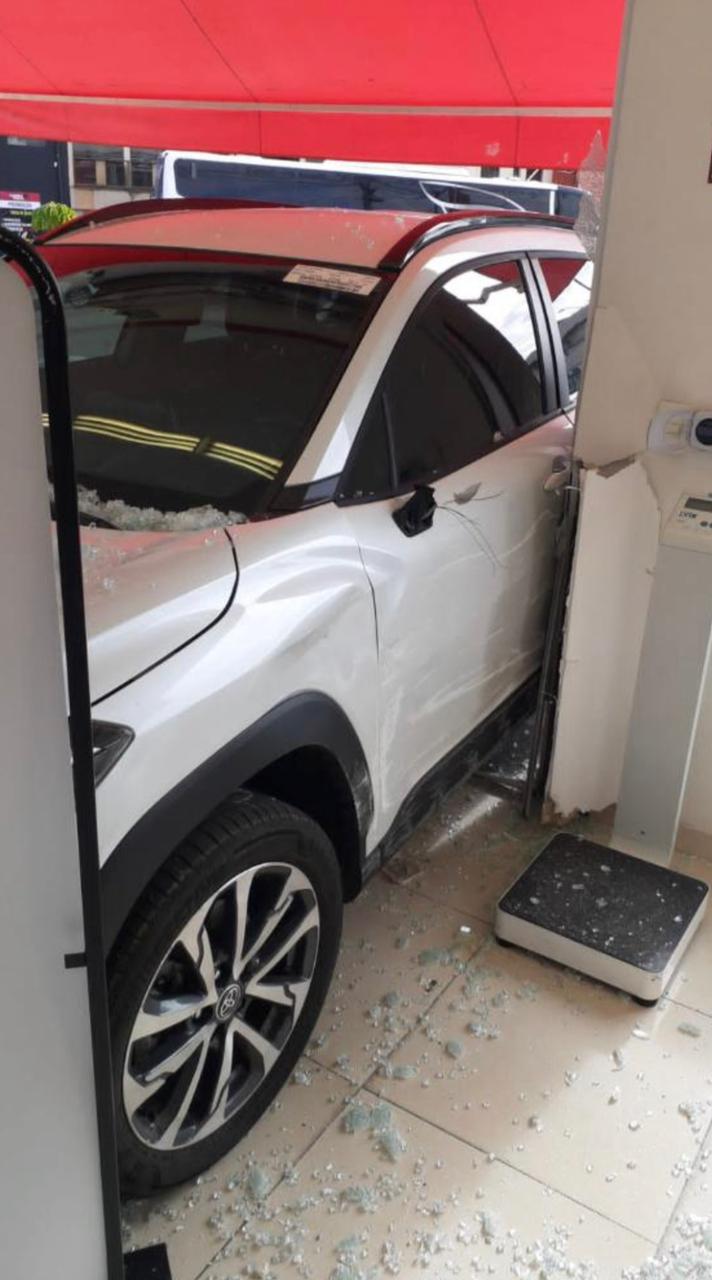Na farmácia além da porta de vidro que foi quebrada, outros danos materiais foram causados pela batida. Já o veículo, teve a porta do motorista amassada e arranhões no para-choque.