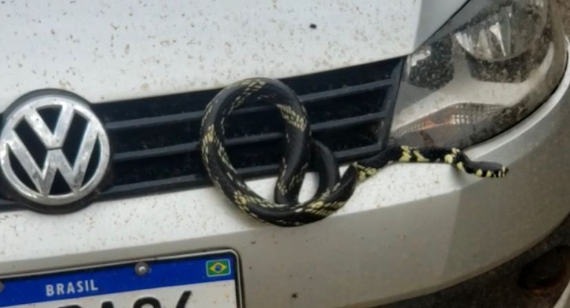 Motorista que conduzia o veículo em rodovia, após perceber a situação acionou a Polícia Rodoviária Federal que resgatou o animal conhecida como caninana e nome cientifico Spilotes pullatus