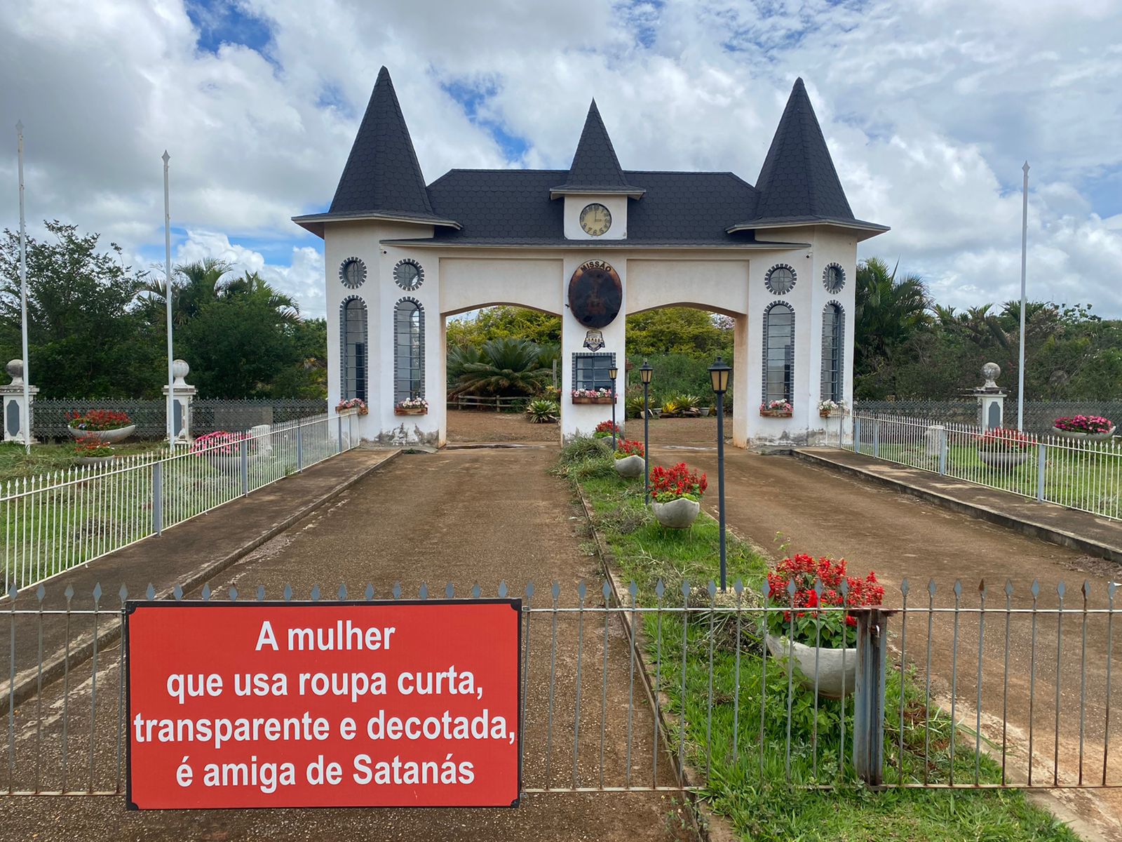 “Mulher que usa roupa curta é amiga de satanás”. Placa com dizeres como esse tem chamado atenção de quem passa pelo povoado de Miranápolis, em Anápolis (GO). As mensagens dispostas próximo a prédios religiosos tem causado polêmica na cidade e na internet. O local fica às margens da BR-153 e tem o nome de Cidade Missionária do Santíssimo Crucifixo.