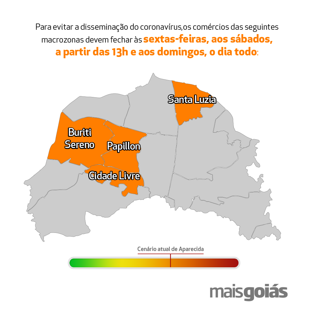 Dados da Secretaria Municipal de Saúde de Aparecida revelam que atualmente a cidade está em um risco alto de contaminação. Por isso, a cidade será dividida em 10 macrozonas. Quatro delas deverão fechar duas vezes, de segunda a sexta-feira. Além disso, a cidade inteira fecha aos sábados, a partir às 13 horas, e no domingo o dia todo.