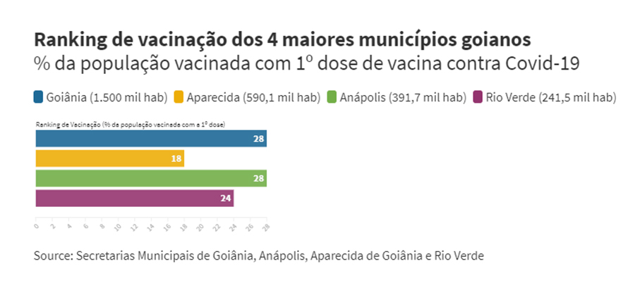 Com 18% da população vacinada com a primeira dose do imunizante contra a Covid-19, Aparecida continua em último lugar no ranking de vacinação das quatro maiores cidades de Goiás em termos de número de habitantes. A Goiânia e Anápolis têm 28% dos habitantes protegidos com a primeira aplicação. Já o município de Rio Verde, quarta cidade mais populosa do estado, está com 24% da população vacinada.