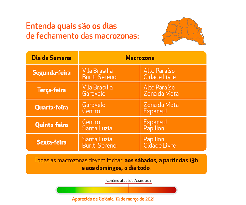 Na segunda-feira, fecham as macrozonas: Vila Brasília, Buriti Sereno, Alto Paraíso e Cidade Livre. Terça-feira, fecham as macrozonas: Vila Brasília, Garavelo, Alto Paraíso e Zona da Mata. Quarta-feira é a vez das macrozonas do Garavelo, Centro, Zona da Mata e Expansul. Na quinta-feira ficam fechadas as macrozonas do Centro, Santa Luzia, Expansul e Papillon. Sexta-feira fecha as macrozonas do Santa Luzia, Buriti Sereno, Papillon e Cidade Livre. Todas as macrozonas fecham no sábado das 13h e no domingo o dia todo.