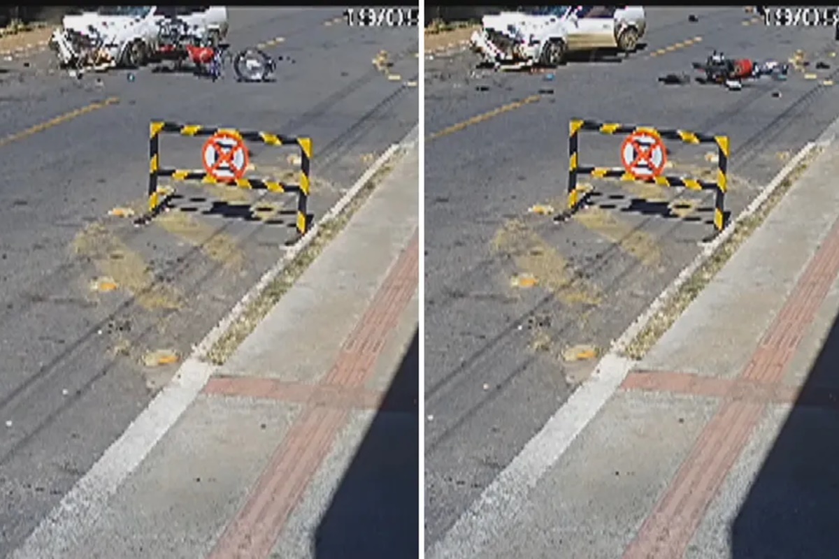 A mulher, que dirigia o carro, logo sai e pega um bebê que estava na parte de trás do veículo. Tanto a parte dianteira do carro quanto a moto ficaram destruídos.