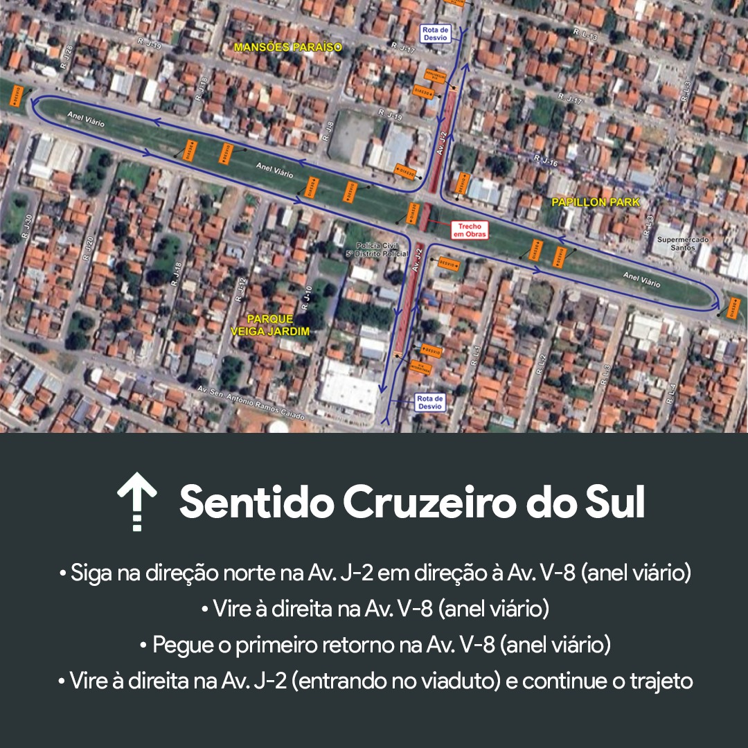 • Motoristas que trafegam sentido Cruzeiro do Sul deverão acessar o Anel Viário, realizar o retorno e voltar à Avenida J2, evitando passar por baixo do viaduto.