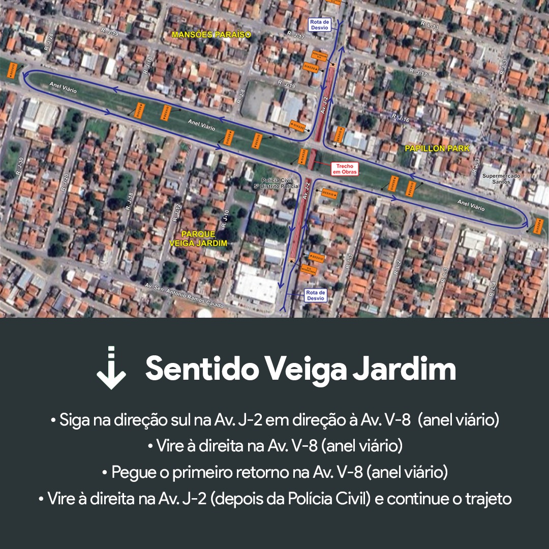 • Motoristas que seguem sentido Veiga Jardim também deverão entrar no Anel Viário, utilizar o primeiro retorno disponível e voltar para a Avenida J2.