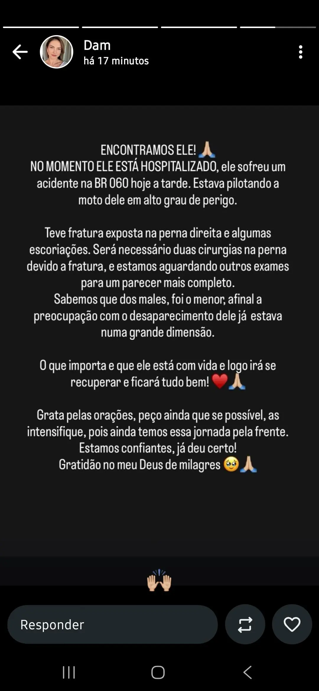 “Será necessário fazer duas cirurgias na perna devido à fratura, e estamos aguardando outros exames para um parecer mais completo. Sabemos que dos males, foi o menor. Afinal, a preocupação com o desaparecimento dele já estava numa grande dimensão”, diz uma filha do policial. “O que importa é que ele está com vida e logo irá se recuperar”.