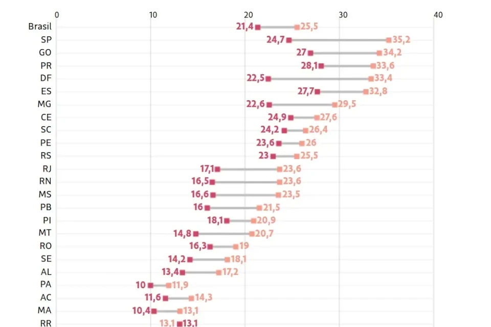Além de Goiás, outros estados que lideravam o ranking antes da pandemia também apresentaram queda. O Paraná passou de 33,6% para 28,1%. O Distrito Federal caiu de 33,4% para 22,5%. O Espírito Santo recuou de 32,8% para 27,7%, enquanto Minas Gerais saiu de 29,5% para 22,6%.