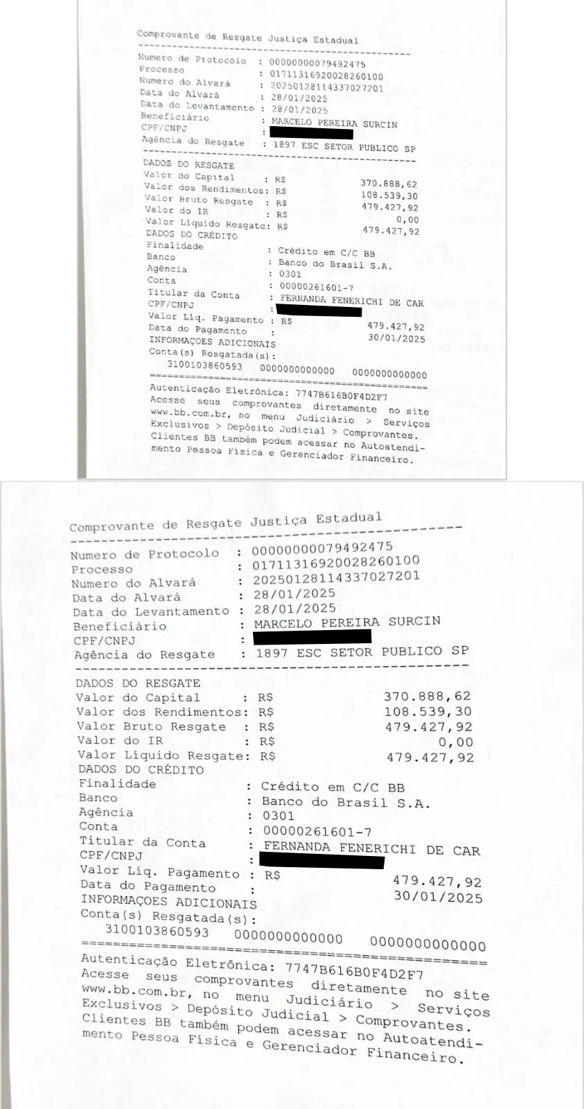 O ex-atleta, que registrou boletim de ocorrência na Polícia Civil, afirma que não foi avisado sobre a movimentação e que só soube do direito ao valor no fim do ano passado, quando, durante uma transmissão ao vivo na internet, foi questionado por um telespectador sobre o processo judicial, que seria o ex-namorado de Fernanda, conforme o ex-jogador. Ao checar o andamento, ele descobriu que os valores foram creditados na conta da advogada por meio de um alvará judicial de 28 de janeiro de 2025.